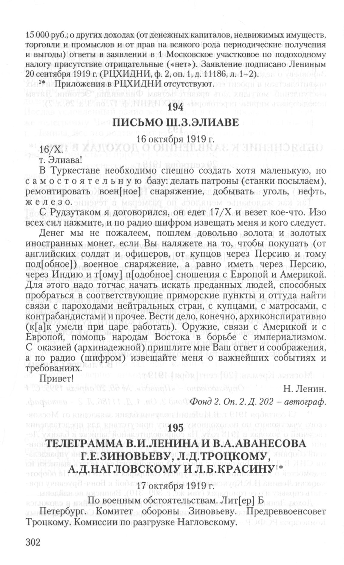 Телеграмма В.И. Ленина и В.А. Аванесова Г.Е. Зиновьеву, Л.Д. Троцкому, А.Д. Нагловскому и Л.Б. Красину. 17 октября 1919 г.