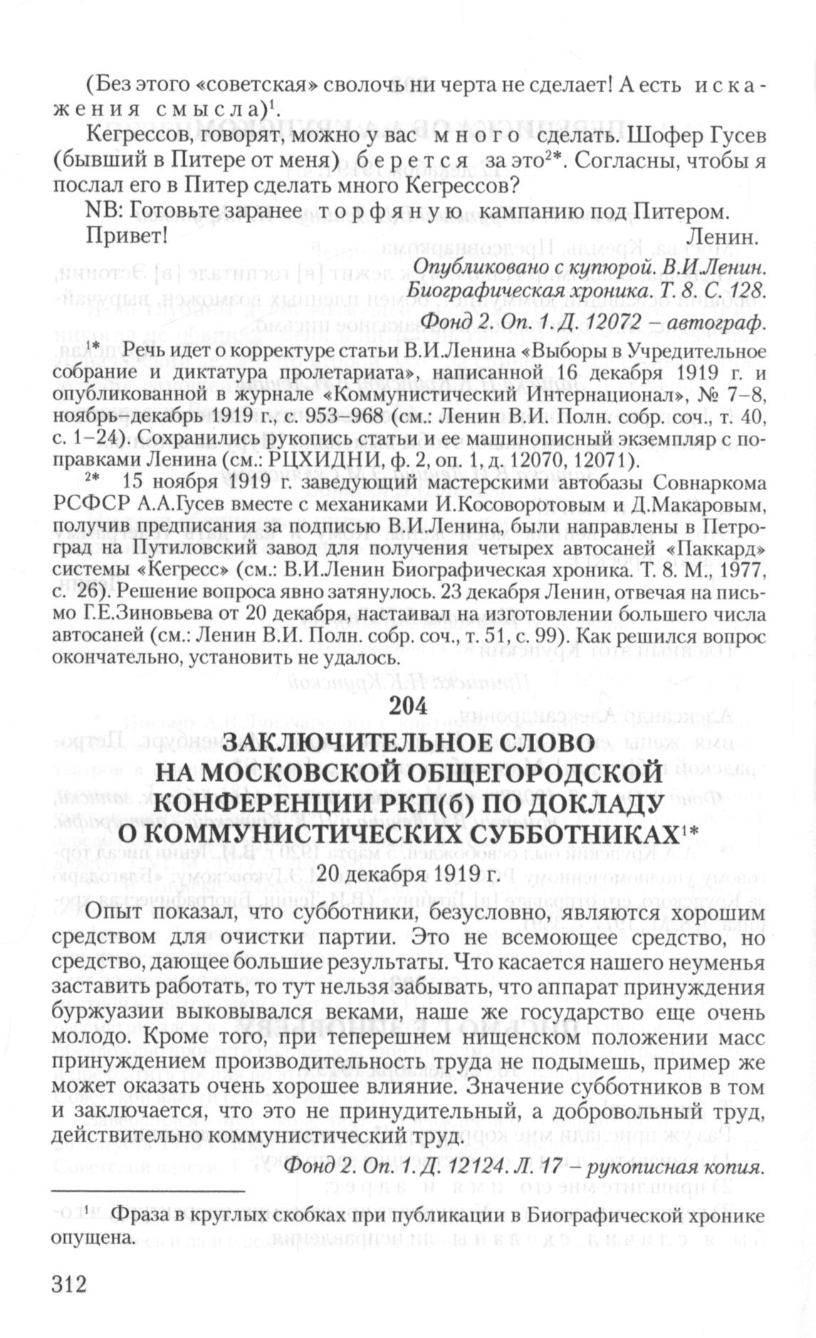 - a. ↑ Московская общегородская конференция РКП(б) состоялась 20-21 декабря 1919 г. На ней были обсуждены вопросы: о Всероссийской партийной конференции, о топливе, о субботниках, об эпидемии сыпного тифа и мерах борьбы с ней, о продовольственном положении Москвы, о Всевобуче и отрядах особого назначения. В.И.Ленин выступил с докладом о субботниках (см.: Ленин В.И. Полн, собр. соч., т. 40, с. 32-38). Конференцией был заслушан также доклад об организационной стороне субботников. Московский комитет РКП(б) разработал и утвердил «Положение о субботниках» (опубликовано в газете «Правда» 27 декабря 1919 г.). Для непосредственного руководства субботниками при МК РКП(б) был создан особый отдел субботников.