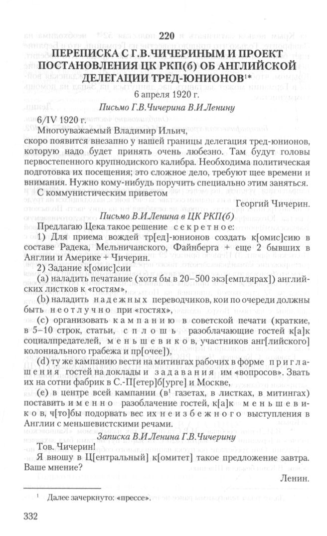 Переписка с Г.В. Чичериным и проект постановления ЦК РКП(б) об английской делегации тред- юнионов. 6 апреля 1920 г.