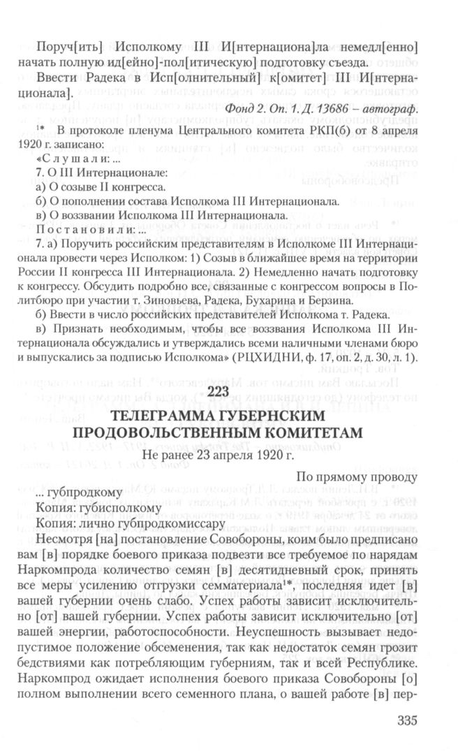 - a. ↑ Речь идет о постановлении Совета Обороны от 3 апреля 1920 г. о мерах по обеспечению семенами потребляющих губерний (см.: Декреты Советской власти. Т. VIII, с. 11-12).