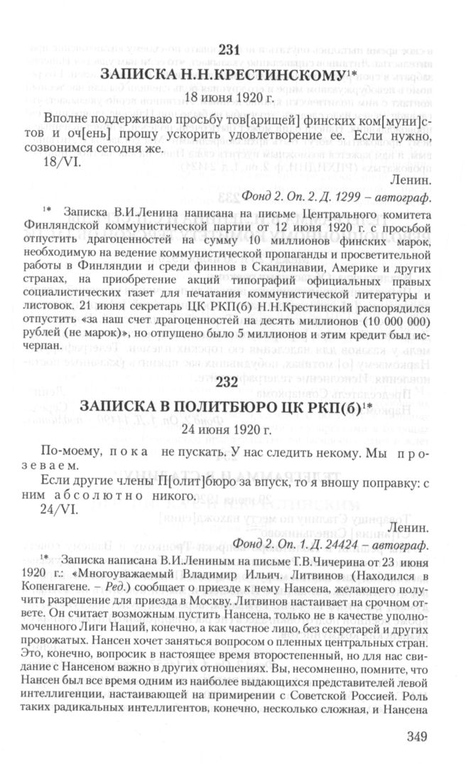 - a. ↑ Записка написана В.И.Лениным на письме Г.В.Чичерина от 23 июня 1920 г.: «Многоуважаемый Владимир Ильич. Литвинов (Находился в Копенгагене. - Ред.) сообщает о приезде к нему Нансена, желающего получить разрешение для приезда в Москву. Литвинов настаивает на срочном ответе. Он считает возможным пустить Нансена, только не в качестве уполномоченного Лиги Наций, конечно, а как частное лицо, без секретарей и других провожатых. Нансен хочет заняться вопросом о пленных центральных стран. Это, конечно, вопросик в настоящее время второстепенный, но для нас свидание с Нансеном важно в других отношениях. Вы, несомненно, помните, что Нансен был все время одним из наиболее выдающихся представителей левой интеллигенции, настаивающей на примирении с Советской Россией. Роль таких радикальных интеллигентов, конечно, несколько сложная, и Нансена в свое время пытались опутать и использовать по-своему антантовские правительства. Литвинов справедливо указывает, что если нам удастся Нансена забрать в свои руки, он нам может быть в высшей степени полезен. Его реноме в левобуржуазном мире и его крупная роль сделали бы для нас тесный контакт с ним политически крайне ценным. Литвинов верно указывает, что главное, за чем надо следить, это чтобы не было при Нансене зловредных сопровождающих. Нансен один может быть очень полезен, а приставленные к нему провожатые могут быть архизловредными. Мы согласны с Литвиновым, и нам кажется возможным пустить сюда Нансена как частное лицо без провожатых» (РЦХИДНИ, ф. 2, оп. 1, д. 24424).