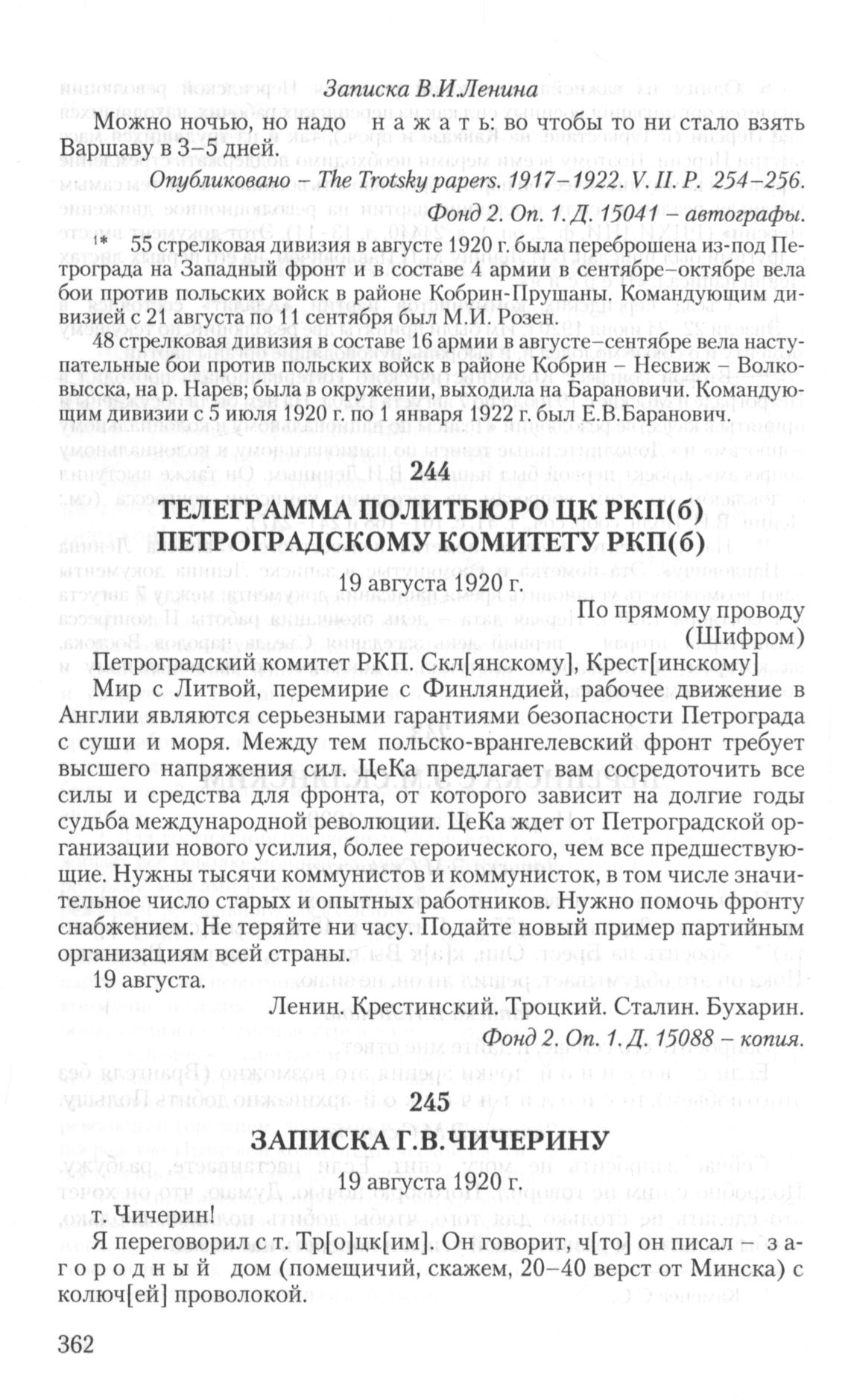 Телеграмма Политбюро ЦК РКП(б) Петроградскому комитету РКП(б). 19 августа 1920 г.