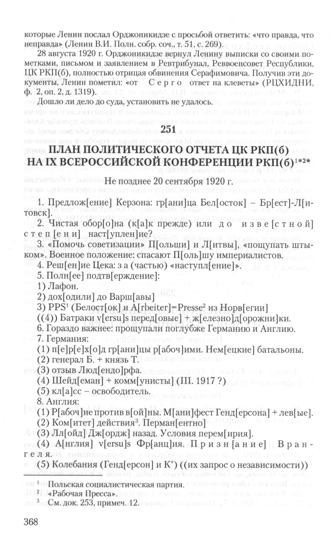- b. ↑ Политический отчет ЦК РКП(б) - см. док. 253, а также: Исторический архив, 1992, № 1, с. 12-22. В 1920 г. текст отчета полностью не был опубликован, в «Правде» и «Известиях ВЦИК» (№ 216 от 29 сентября 1920 г.) пу- бликовалось его сокращенное изложение - газетный отчет (см.: Ленин В.И. Полн. собр. соч., т. 41, с. 281-285).