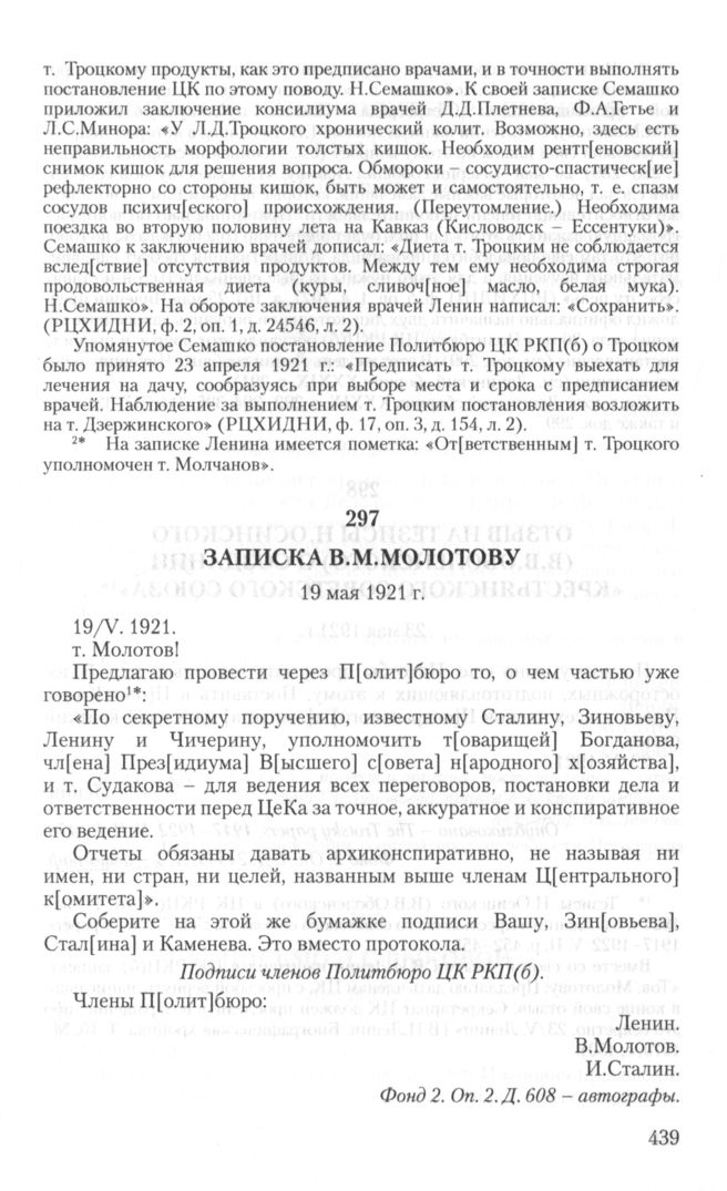 Соберите на этой же бумажке подписи Вашу, Зин[овьева], Стал[ина] и Каменева. Это вместо протокола.