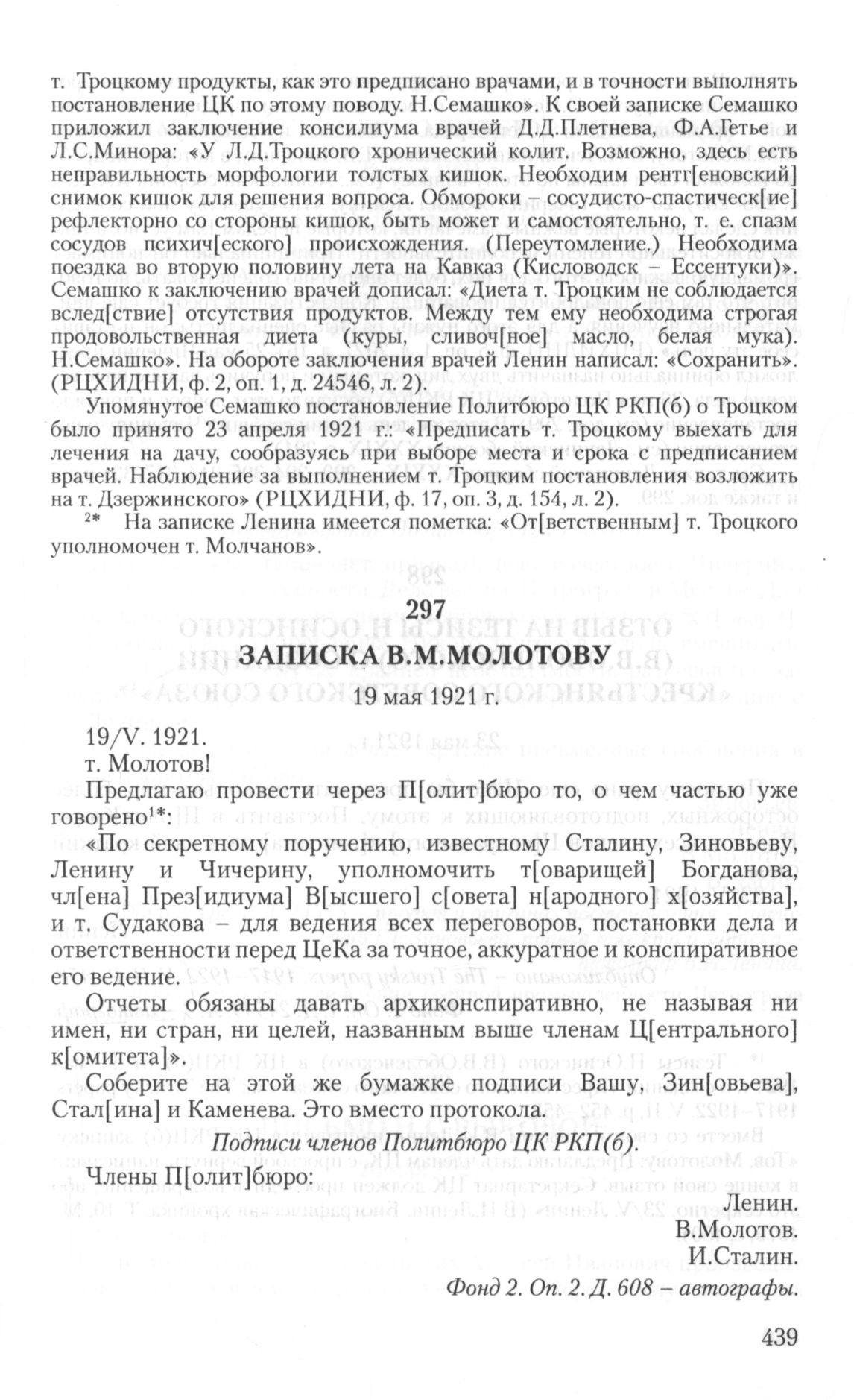 - a. ↑ Речь идет о переговорах с представителем группы немецких промышленных кругов О.Нейманом о восстановлении предприятий военной промышленности Петрограда. Послав публикуемую записку В.М.Молотову, В.И.Ленин написал письмо Г.В.Чичерину, в котором подробно изложил свои планы по этому вопросу (см.: Ленинский сборник XXXIX, с. 288-289). 20 мая Чичерин сообщил Ленину: «По существу мой собеседник сделал некоторые важные замечания, которые передам Вам устно, а также относительно степени исполнительности. Принципиально он понимает громадную важность этого для них, будет энергично содействовать, но говорит, что там еще понадобится пропаганда. Конкретизация требует еще внимательного изучения, а для этого нужны разные специалисты; он и ставит себе эту цель» (РЦХИДНИ, ф. 5, оп. 1, д. 2027, л. 16). 25 мая Чичерин предложил официально назначить двух лиц, которым и поручить дальнейшее ведение дела. 26 мая Политбюро ЦК РКП(б) обсудило этот вопрос и приняло постановление (см. док. 299). В этот же день Ленин сообщил Чичерину о постановлении (см.: Ленинский сборник XXXIX, с. 291). См. также: Ленинский сборник XXXIX, с. 292-294,305,314,317,321 и др. и также док. 299.