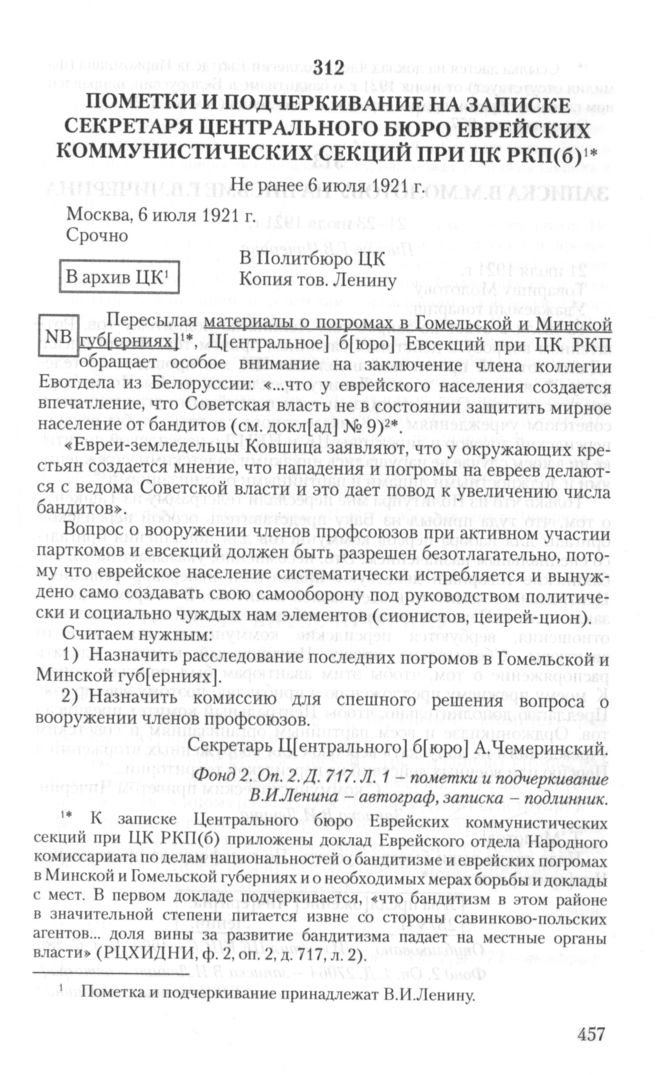 - b. ↑ Ссылка дается на доклад члена коллегии Евотдела Наркомнаца (фамилия отсутствует) от июня 1921 г. о бандитизме в Белоруссии, направленном главным образом против еврейского населения (там же, л. 28). См. также док. 257.
