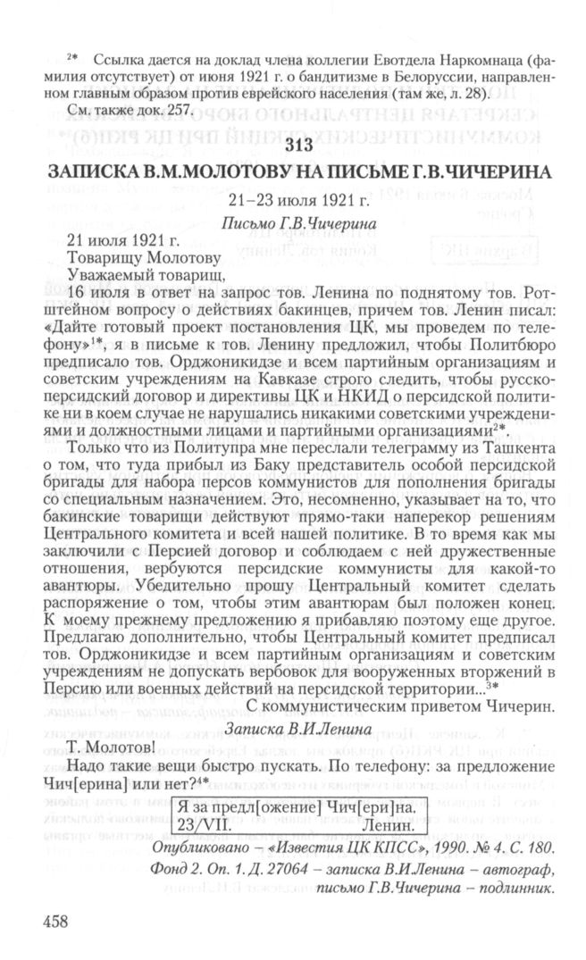 16 июля в ответ на запрос тов. Ленина по поднятому тов. Рот- штейном вопросу о действиях бакинцев, причем тов. Ленин писал: «Дайте готовый проект постановления ЦК, мы проведем по телефону» [a] , я в письме к тов. Ленину предложил, чтобы Политбюро предписало тов. Орджоникидзе и всем партийным организациям и советским учреждениям на Кавказе строго следить, чтобы русско-персидский договор и директивы ЦК и НКИД о персидской политике ни в коем случае не нарушались никакими советскими учреждениями и должностными лицами и партийными организациями [b] .