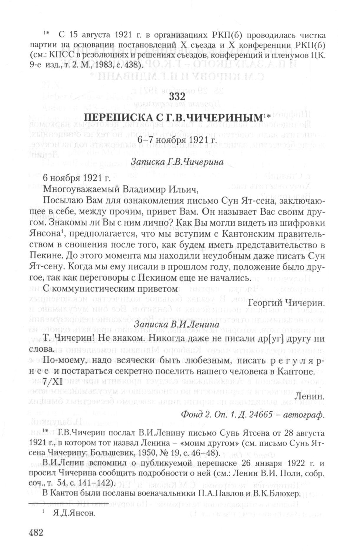 - a. ↑ Г.В.Чичерин послал В.И.Ленину письмо Сунь Ятсена от 28 августа 1921 г., в котором тот назвал Ленина - «моим другом» (см. письмо Сунь Ятсена Чичерину: Большевик, 1950, № 19, с. 46-48). В.И.Ленин вспомнил о публикуемой переписке 26 января 1922 г. и просил Чичерина сообщить подробности о ней (см.: Ленин В.И. Полн, собр. соч.,т. 54, с. 141-142). В Кантон были посланы военачальники П.А.Павлов и В.К.Блюхер.