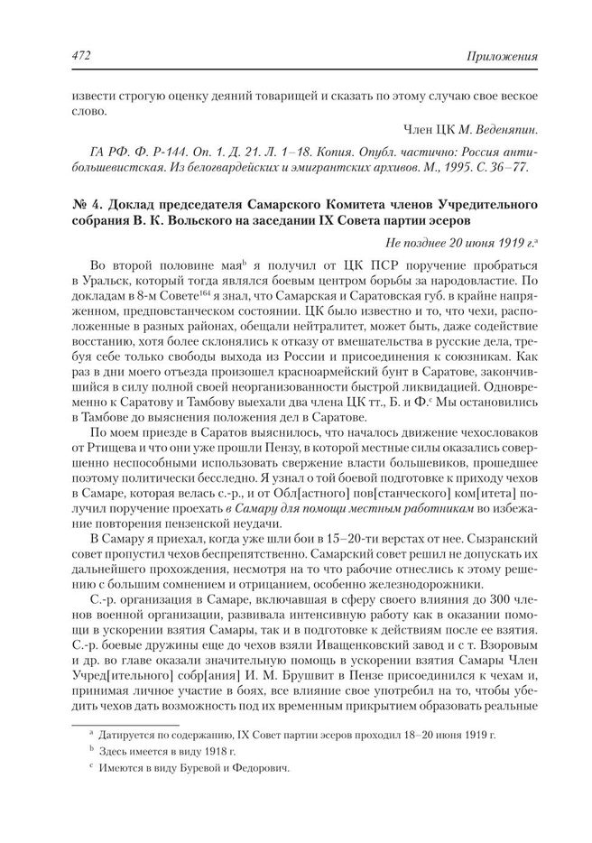 Доклад председателя Самарского Комитета членов Учредительного собрания В. К. Вольского на заседании IX Совета партии эсеров. Не позднее 20 июня 1919 г. // РГАСПИ. Ф. 17. Оп. 84. Д. 43. Л. 1–18. Копия.; Исторический архив. 1993. № 3. С. 123–147.