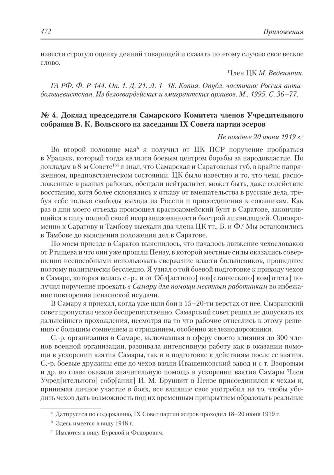 Доклад председателя Самарского Комитета членов Учредительного собрания В. К. Вольского на заседании IX Совета партии эсеров. Не позднее 20 июня 1919 г.