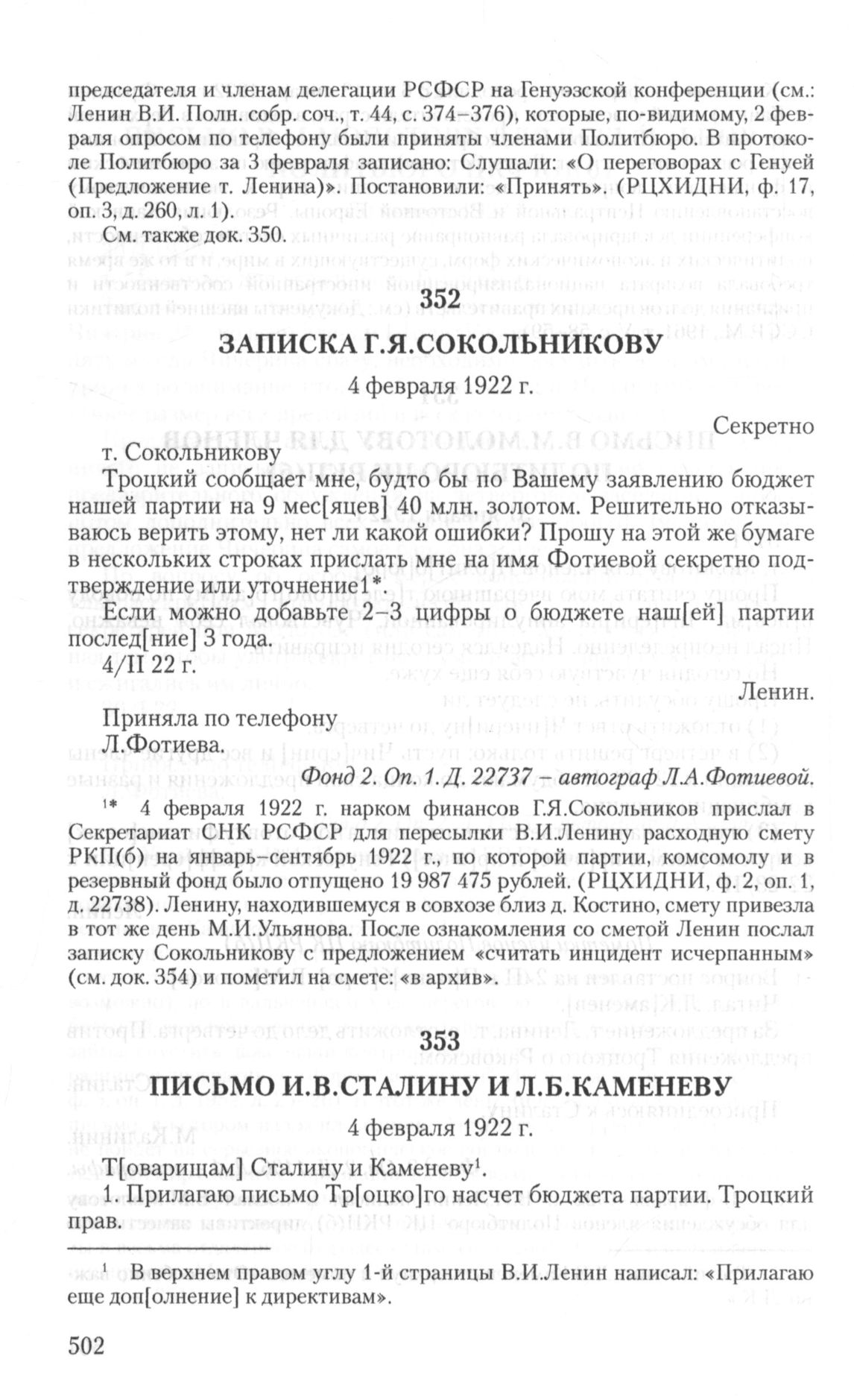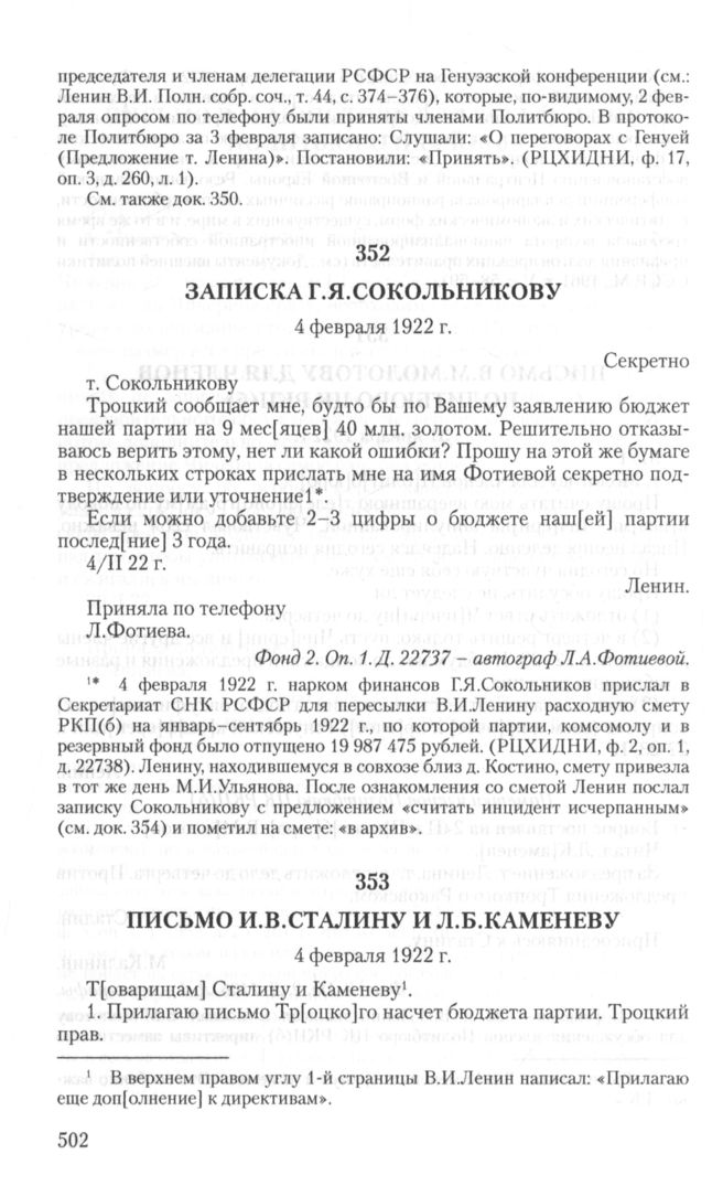 - a. ↑ 4 февраля 1922 г. нарком финансов Г.Я.Сокольников прислал в Секретариат СНК РСФСР для пересылки В.И.Ленину расходную смету РКП(б) на январь-сентябрь 1922 г., по которой партии, комсомолу и в резервный фонд было отпущено 19 987 475 рублей. (РЦХИДНИ, ф. 2, on. 1, д. 22738). Ленину, находившемуся в совхозе близ д. Костино, смету привезла в тот же день М.И.Ульянова. После ознакомления со сметой Ленин послал записку Сокольникову с предложением «считать инцидент исчерпанным» (см. док. 354) и пометил на смете: «в архив».