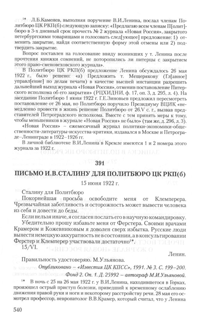 - a. ↑ В ночь с 25 на 26 мая 1922 г. у В.И.Ленина, находившегося в Горках, произошел острый приступ болезни, приведший к временному ослаблению движения правой руки и ноги и некоторому расстройству речи. 28 мая его осмотрел профессор, невропатолог В.В.Крамер, который считал, что у Ленина «явления транскортикальной моторной афазии на почве тромбоза». На другой день утром состоялась консультация профессоров Г.И.Россолимо и Крамера, врача Ф.А.Гетье, народного комиссара здравоохранения Н.А.Семашко и врача-невропатолога А. М.Кожевникова. Последний с этого дня находился в Горках в качестве дежурного врача. 2 июня из Германии прилетел профессор О.Ферстер и провел в тот же день обследование Ленина. 3 июня И.В.Сталин по поручению Политбюро ЦК РКП(б) обязал Н.Н.Крестинского добиться приезда профессоров О.Ферстера и Г.Клемперера на лето в Москву (см.: РЦХИДНИ, ф. 558, оп. 2, д. 55). Клемперер приехал в Москву 10 июня и 11 осмотрел Ленина. После второго посещения Ленин в разговоре с Кожевниковым высказал отрицательное мнение о проф. Клемперере и продиктовал М.И.Ульяновой публикуемое письмо. М.И.Ульянова в своих воспоминаниях писала о немецких врачах: «В отличие от профессора Ферстера, Клемперер обладал меньшим тактом и умением подходить к больному. Его болтовня и шуточки раздражали Владимира Ильича, хотя он встретил его очень любезно и наружно был с ним очень вежлив» (Известия ЦК КПСС, 1991, № 1, с. 191). На публикуемое письмо Сталин ответил Ленину 17 июня: «Т. Ленину. В связи с Вашим письмом о немцах мы немедленно устроили совещание с Крамером, Кож[евниковым] и Гетье. Они единогласно признали ненужность в дальнейшем Клемперера, который посетит Вас лишь один раз перед отъездом. Столь же единогласно они признали полезность участия Ф[ерстера] в общем наблюдении за ходом Вашего выздоровления. Кроме того, полит[ические] соображения делают крайне полезными подписи извест[ных] иностр[анных] авторитетов под бюллетенями, ввиду сугубого вранья за границей. По пор[учению] П[олит]б[юро] Сталин. 17/V1-22 г. P.S. Крепко жму руку. А все-таки русские одолеют немцев. Сталин» (там же, с. 192). См. также док. 392.
