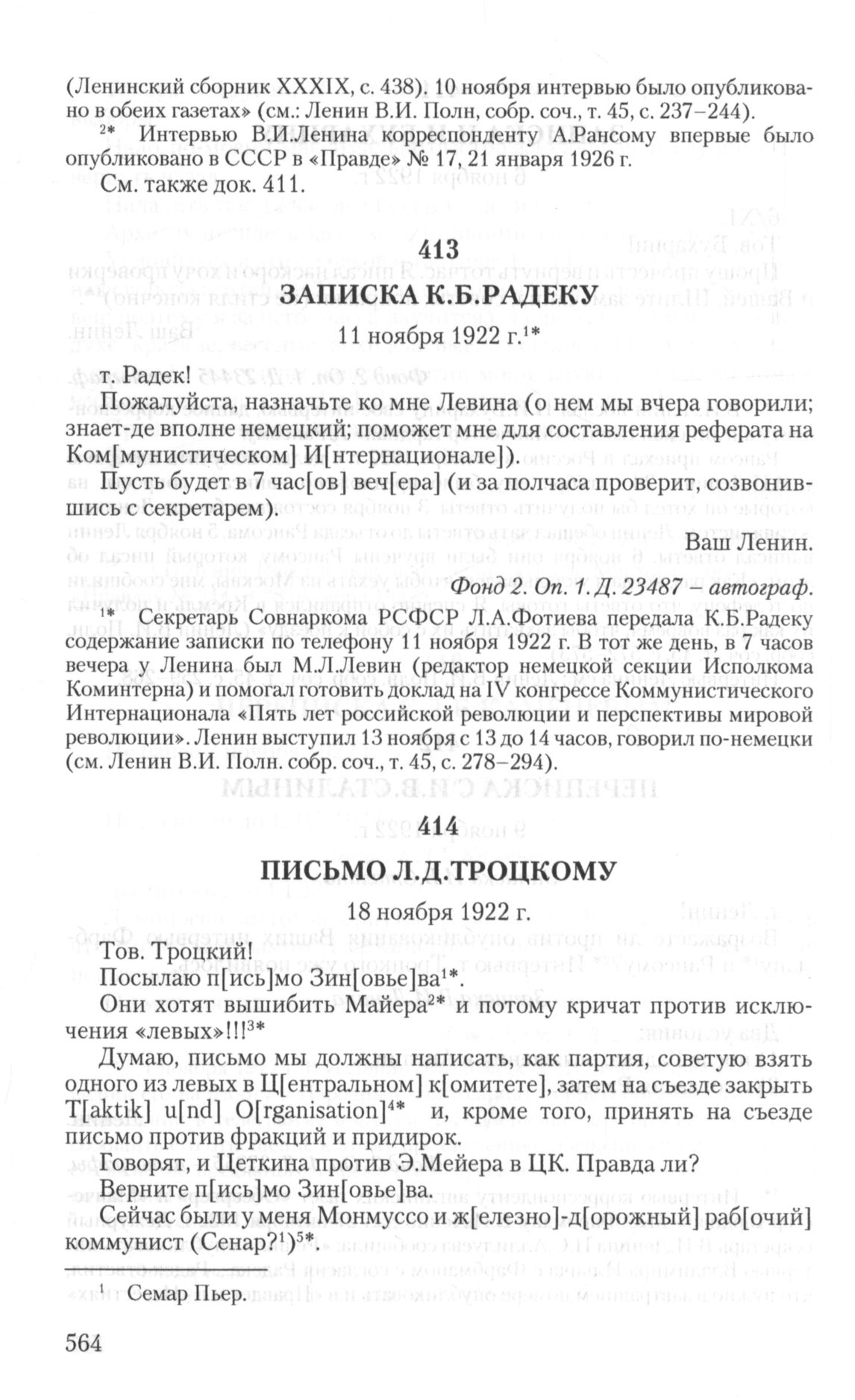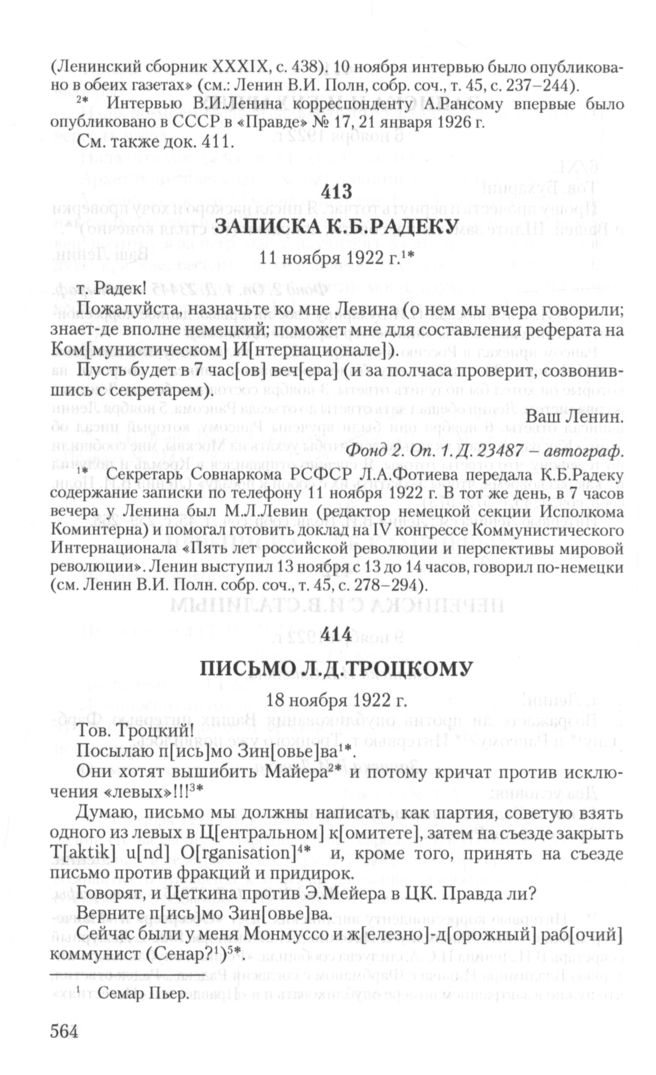 - a. ↑ Секретарь Совнаркома РСФСР Л.А.Фотиева передала К.Б.Радеку содержание записки по телефону 11 ноября 1922 г. В тот же день, в 7 часов вечера у Ленина был М.Л.Левин (редактор немецкой секции Исполкома Коминтерна) и помогал готовить доклад на IV конгрессе Коммунистического Интернационала «Пять лет российской революции и перспективы мировой революции». Ленин выступил 13 ноября с 13 до 14 часов, говорил по-немецки (см. Ленин В.И. Полн. собр. соч., т. 45, с. 278-294).