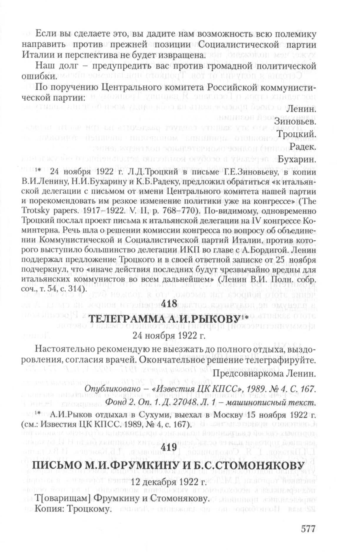 - a. ↑ А.И.Рыков отдыхал в Сухуми, выехал в Москву 15 ноября 1922 г. (см.: Известия ЦК КПСС. 1989, № 4, с. 167).