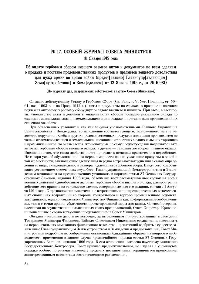 Особый журнал совета министров. 31 января 1915 г. Об оплате гербовым сбором низшего размера актов и документов по всем сделкам о продаже и поставке продовольственных продуктов и предметов вещевого довольствия для нужд армии во время войны (предст[авлено] Главноупр[авляющим] Земл[еустройством] и Земл[еделием] от 12 Января 1915 г., за № 10981) // РГИА Ф. 1276. Оп. 20. Д. 82. Л. 219–220; Ф. 1276. Оп. 11. Д. 967.