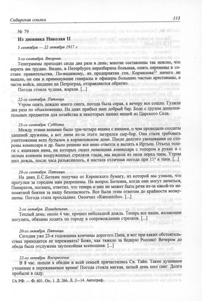 Из дневника Николая II. 5 сентября — 22 октября 1917 г. // ГА РФ. — Ф. 601. Оп. 1. Д. 266. Л. 2—14. Автограф.