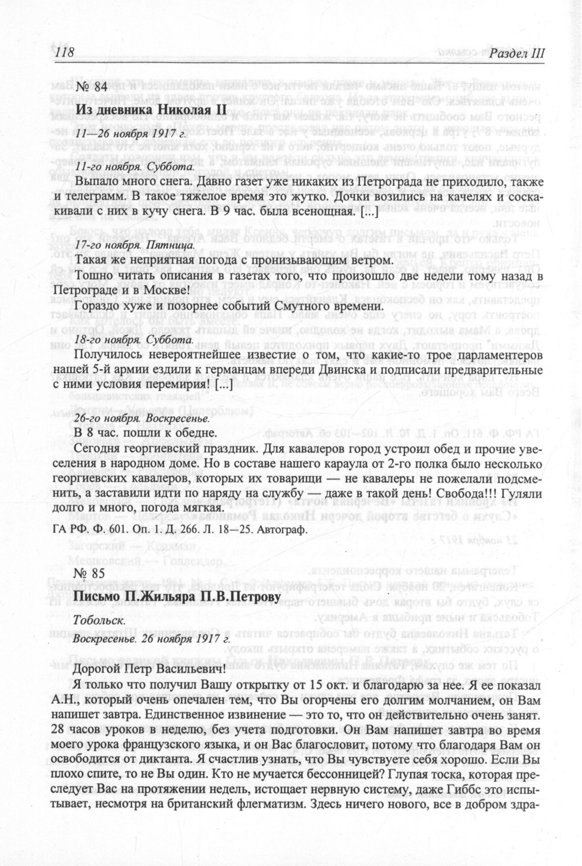 Письмо П.Жильяра П.В.Петрову. Тобольск. Воскресенье. 26 ноября 1917 г. // ГА РФ. Ф. 611. Оп. 1. Д. 50. Л .25—25об. Автограф (на франц. яз.).