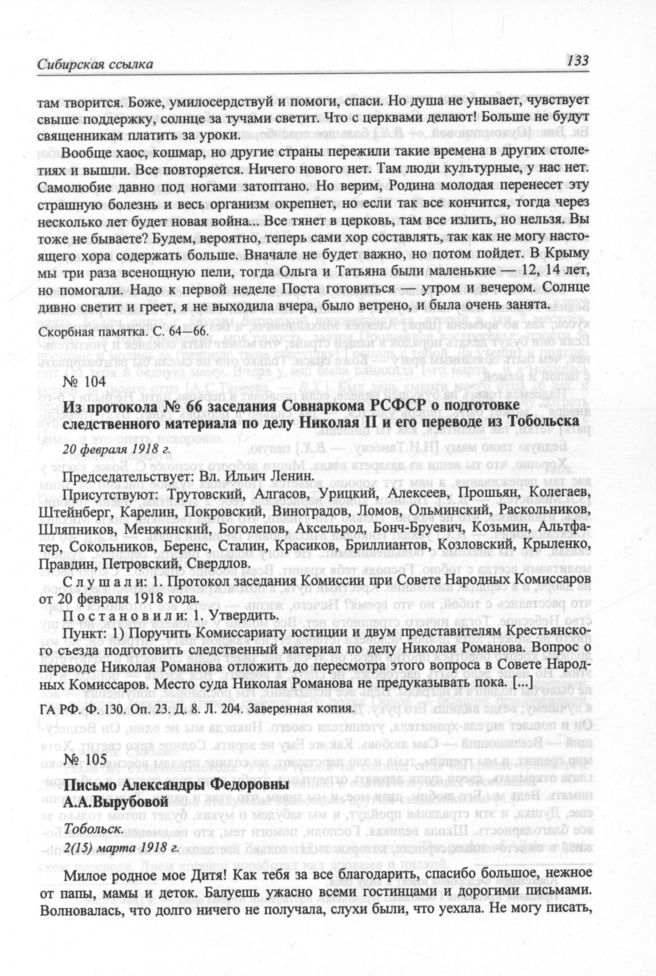 Из протокола № 66 заседания Совнаркома РСФСР о подготовке следственного материала по делу Николая II и его переводе из Тобольска. 20 февраля 1918 г. // ГА РФ. Ф. 130. Оп. 23. Д. 8. Л. 204. Заверенная копия.