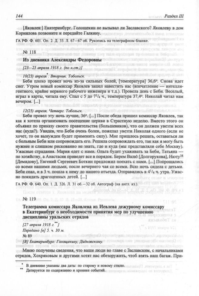 Архив новейшей истории России. Серия «Публикации». Т. III. Скорбный путь Романовых (1917—1918 гг.). Гибель царской семьи. Сб. документов и материалов. — М.: РОССПЭН, 2001.