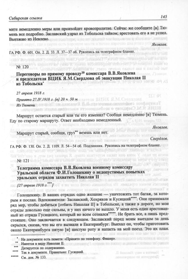Переговоры по прямому проводу комиссара В.В.Яковлева и председателя ВЦИК Я.М.Свердлова об эвакуации Николая II из Тобольска. 27 апреля 1918 г. Принято 27.IV. 1918 г. [в] 20 ч. 50 м. Из Тюмени // ГА РФ. Ф. 130. Оп. 2. Д. 1109. Л. 54—54 об. Подлинник. Рукопись на телеграфном бланке.
