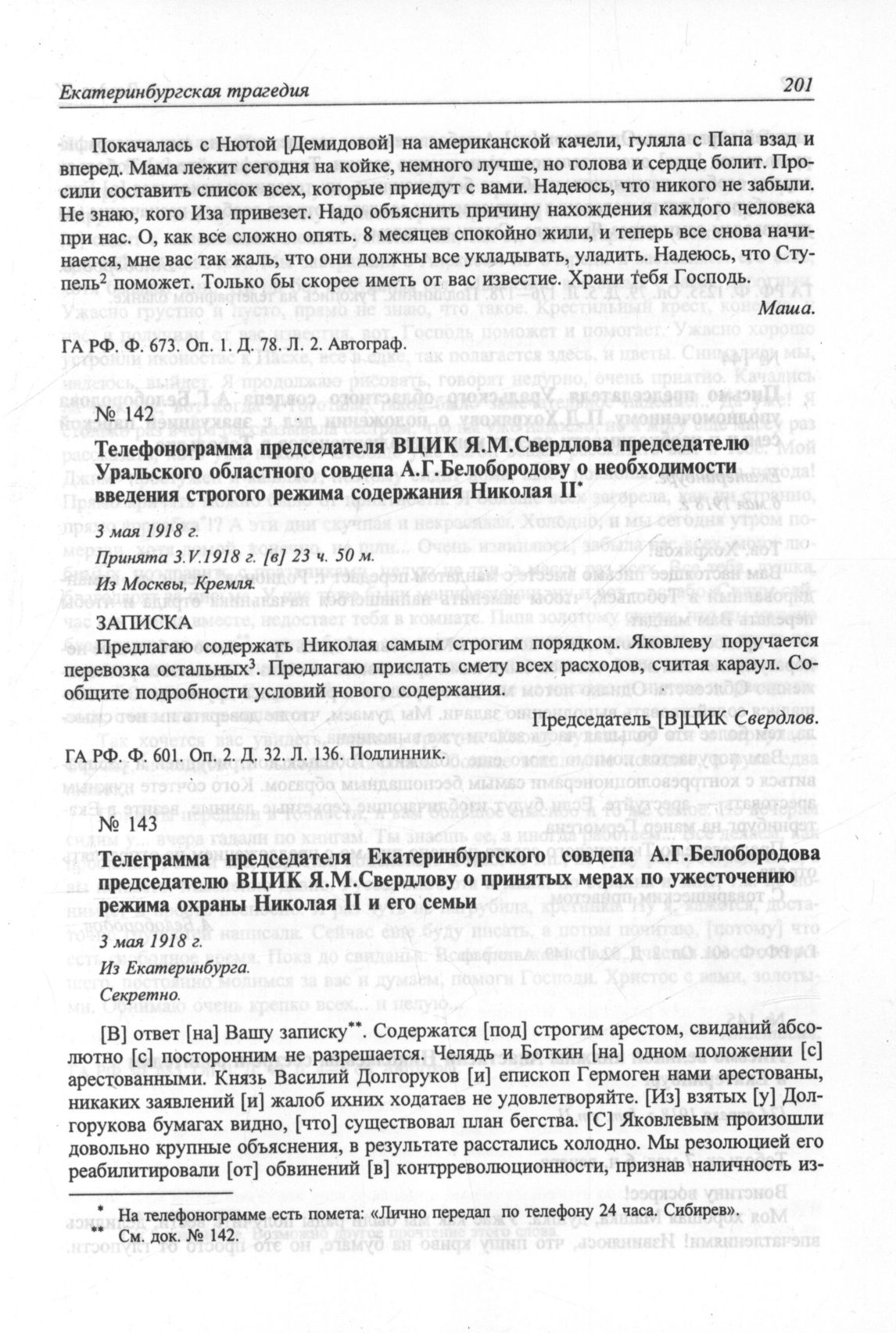 Телеграмма председателя Екатеринбургского совдепа А.Г.Белобородова председателю ВЦИК Я.М.Свердлову о принятых мерах по ужесточению режима охраны Николая II и его семьи. 3 мая 1918 г. Из Екатеринбурга. Секретно // ГА РФ. Ф. 1235. Оп. 79. Д. 5. Л. 176—178. Подлинник. Рукопись на телеграфном бланке.