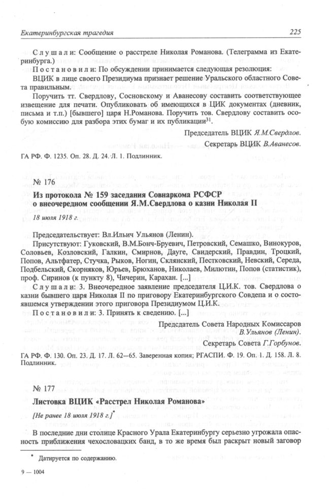 Из протокола № 159 заседания Совнаркома РСФСР о внеочередном сообщении Я.М.Свердлова о казни Николая II. 18 июля 1918 г. // ГА РФ. Ф. 130. Оп. 23. Д. 17. Л. 62—65. Заверенная копия; РГАСПИ. Ф. 19. Оп. 1. Д. 158. Л. 8. Подлинник.