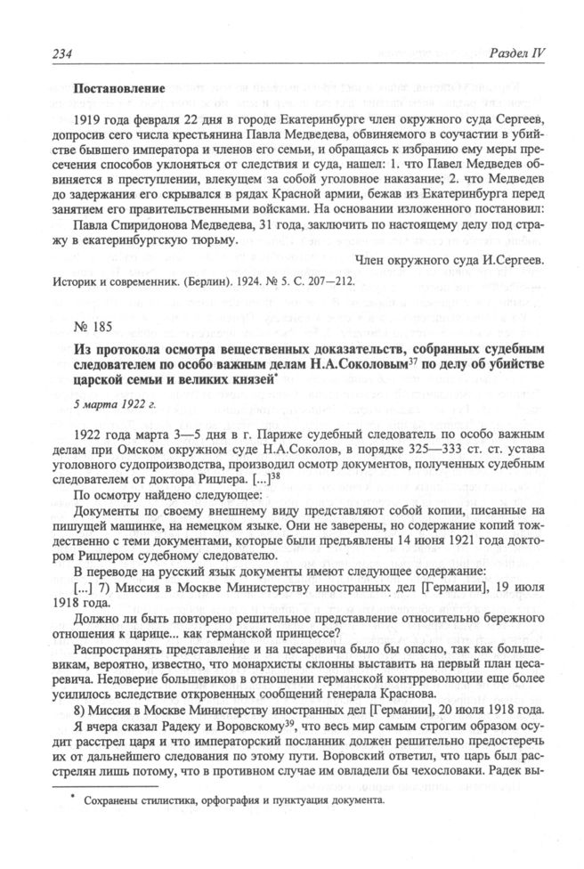 Из протокола осмотра вещественных доказательств, собранных судебным следователем по особо важным делам Н.А.Соколовым по делу об убийстве царской семьи и великих князей. 5 марта 1922 г. // ГА РФ. Ф. 601. Оп. 2. Д. 75. Л. 296—297 об., 297. Заверенная копия.