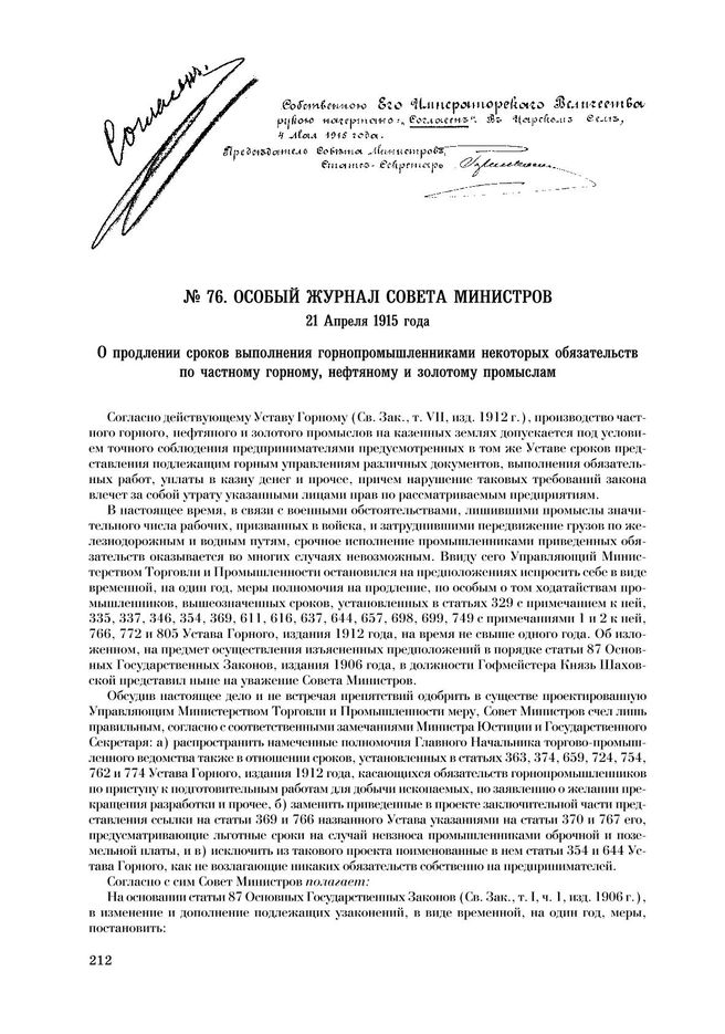 Особый журнал совета министров. 21 апреля 1915 г. О продлении сроков выполнения горнопромышленниками некоторых обязательств по частному горному, нефтяному и золотому промыслам