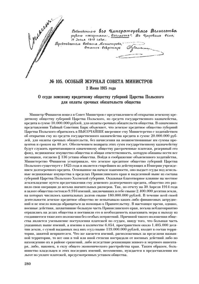 Особый журнал совета министров. 2 июня 1915 г. О ссуде земскому кредитному обществу губерний Царства Польского для оплаты срочных обязательств общества