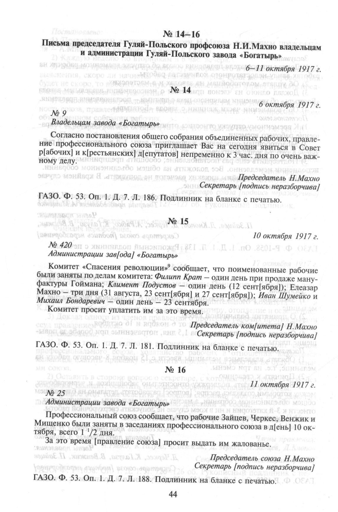 Письма председателя гуляй-польского профсоюза Н.И. Махно владельцам и администрации гуляй-польского завода «Богатырь». 11 октября 1917 г.