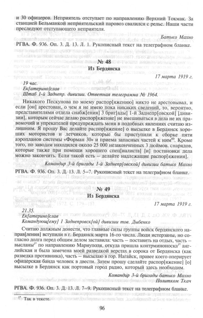 Телеграммы из штаба бригады Махно в штаб 1-й Заднепровской дивизии. Из Бердянска. 17 марта 1919 г. // РГВА. Ф. 936. Оп. 3. Д. 13. Л. 7-9. Рукописный текст на телеграфном бланке.
