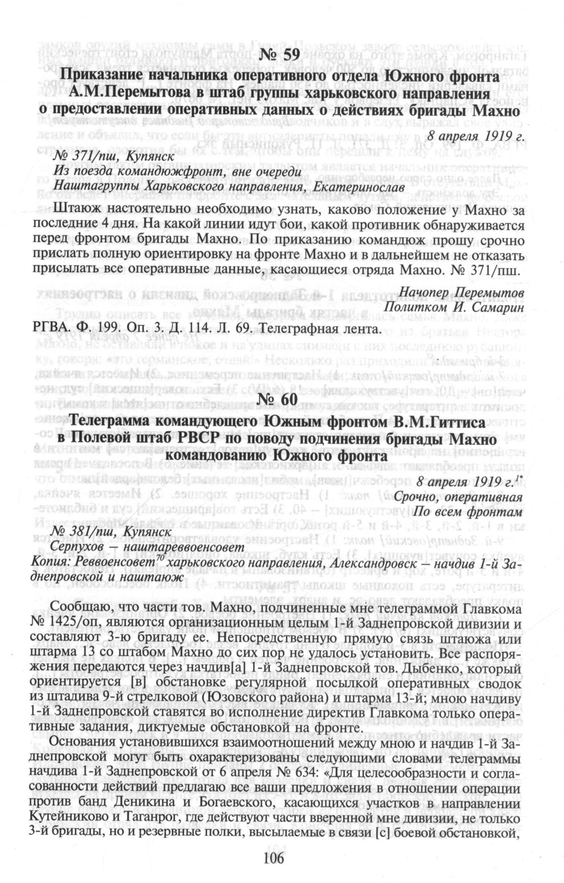 Приказание начальника оперативного отдела Южного фронта А.М. Перемытова в штаб группы харьковского направления о предоставлении оперативных данных о действиях бригады Махно. 8 апреля 1919 г. // РГВА. Ф. 199. Оп. 3. Д. 114. Л. 69. Телеграфная лента.