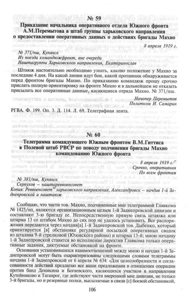Телеграмма командующего Южным фронтом В.М. Гиттиса в Полевой штаб РВСР по поводу подчинения бригады Махно командованию Южного фронта. 8 апреля 1919 г.