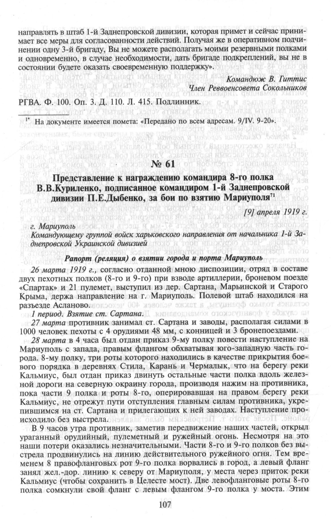 Представление к награждению командира 8-го полка В.В. Куриленко, подписанное командиром 1-й Заднепровской дивизии П.Е. Дыбенко, за бои по взятию Мариуполя. [9] апреля 1919 г. // РГВА. Ф. 936. Oп. 1. Д. 4. Л. 182—183 об. Подлинник.