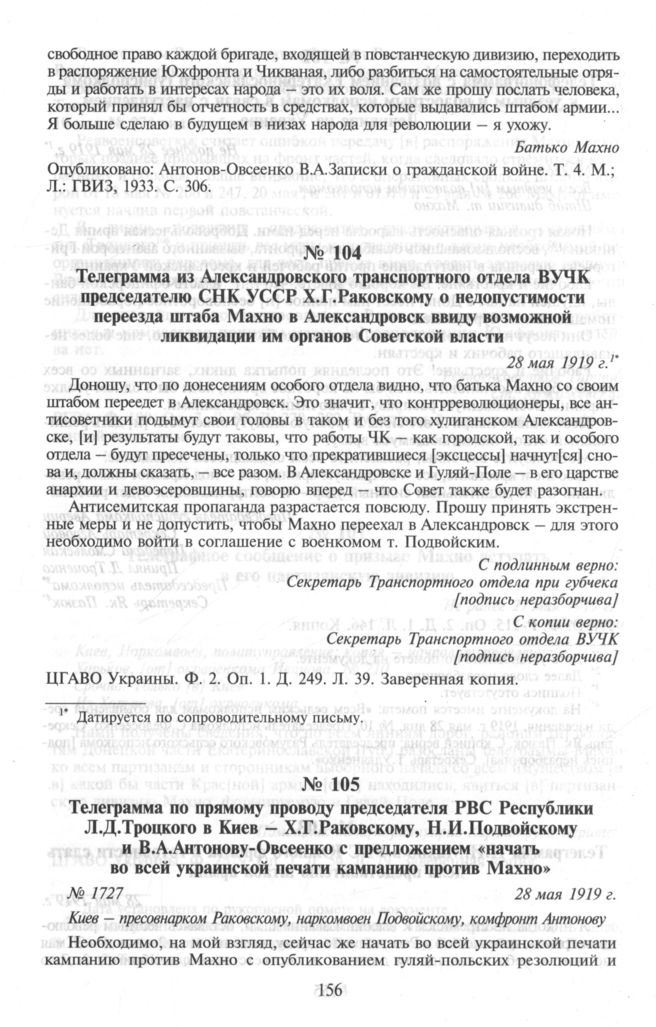 Телеграмма из Александровского транспортного отдела ВУЧК председателю СНК УССР Х.Г. Раковскому о недопустимости переезда штаба Махно в Александровск ввиду возможной ликвидации им органов Советской власти. 28 мая 1919 г. // ЦГАВО Украины. Ф. 2. Oп. 1. Д. 249. Л. 39. Заверенная копия.