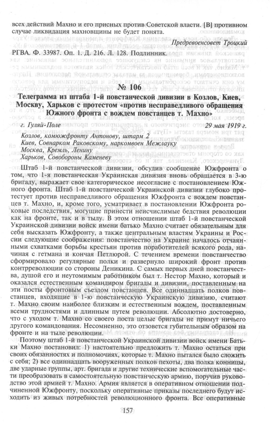 Телеграмма из штаба 1-й повстанческой дивизии в Козлов, Киев, Москву, Харьков с протестом «против несправедливого обращения Южного фронта с вождем повстанцев т. Махно». 29 мая 1919 г. // ЦГАВО Украины. Ф. 2. Оп. 1. Д. 249. Л. 49-51. Телеграфная лента. Антонов-Овсеенко В.А. Записки о гражданской войне. Т. 4. М.; Л.: ГВИЗ, 1933. С. 307-308.