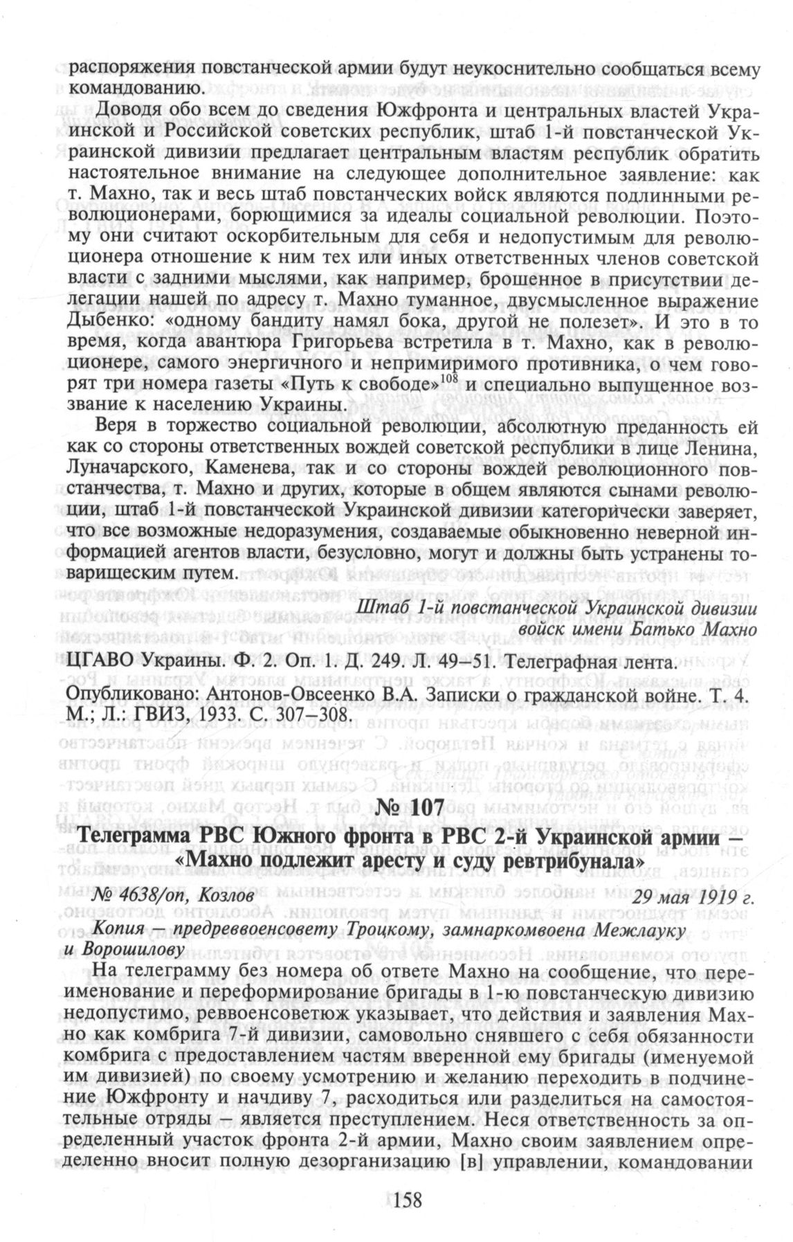 Телеграмма РВС Южного фронта в РВС 2-й Украинской армии - «Махно подлежит аресту и суду ревтрибунала». 29 мая 1919 г. // РГВА. Ф. 100. Оп. 3. Д. 100. Л. 214. Подлинник. Автограф Гиттиса. Частично опубликовано: Антонов-Овсеенко В.А. Записки о гражданской войне. Т. 4. М.; Л.: ГВИЗ, 1933. С. 308.