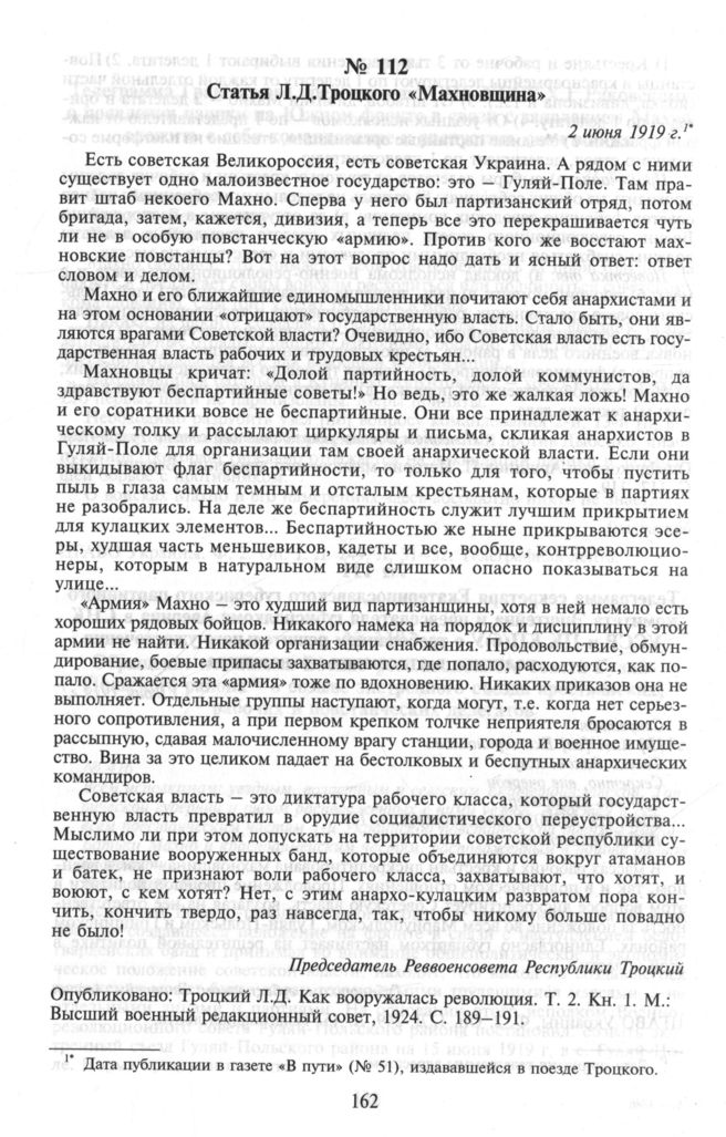 Статья Л.Д. Троцкого «Махновщина». 2 июня 1919 г. // Троцкий Л.Д. Как вооружалась революция. Т. 2. Кн. 1. М.: Высший военный редакционный совет, 1924. С. 189-191.