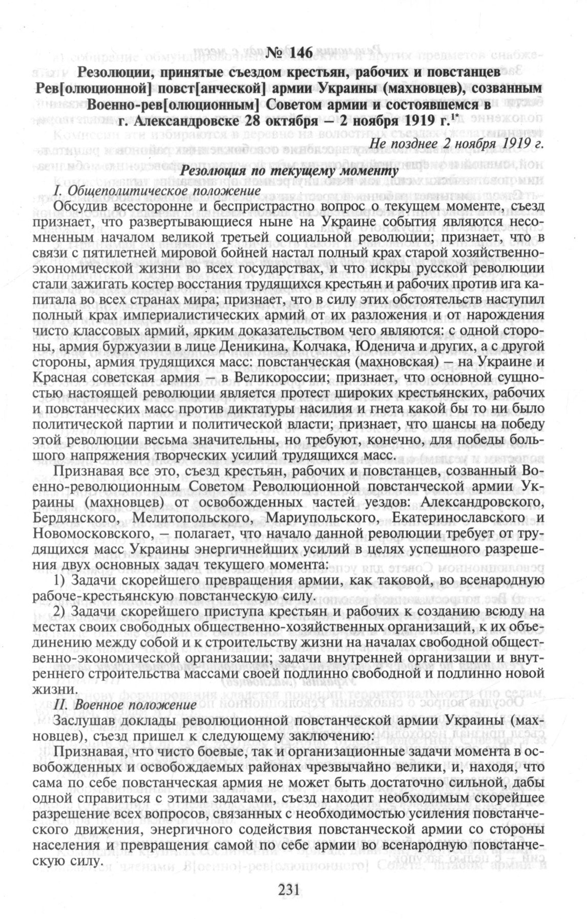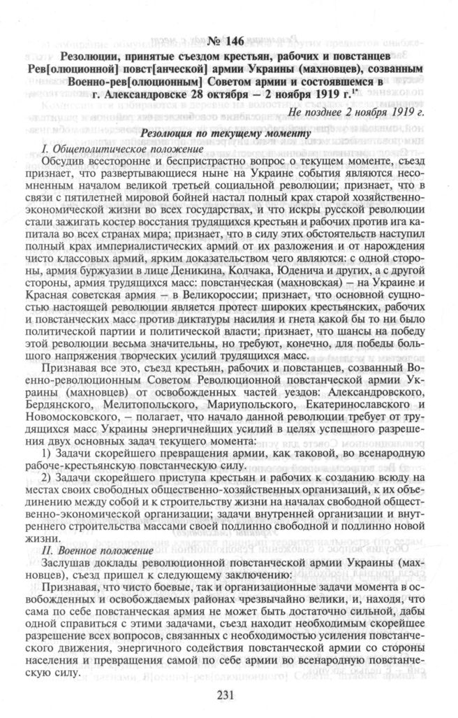 Съезды повстанцев-махновцев в г. Александровске. Резолюции, принятые съездом крестьян, рабочих и повстанцев Рев[олюционной] повст[анческой] армии Украины (махновцев), созванным Военно-рев[олюционным] Советом Повстанческой армии и состоявшемся в г. Александровске 28 октября - 2 ноября 1919 г. Не позднее 2 ноября 1919 г. // ЦГАВО Украины. Ф. 1824. Oп. 1. Д. 3. Л. 4-7 об. Незаверенная копия.