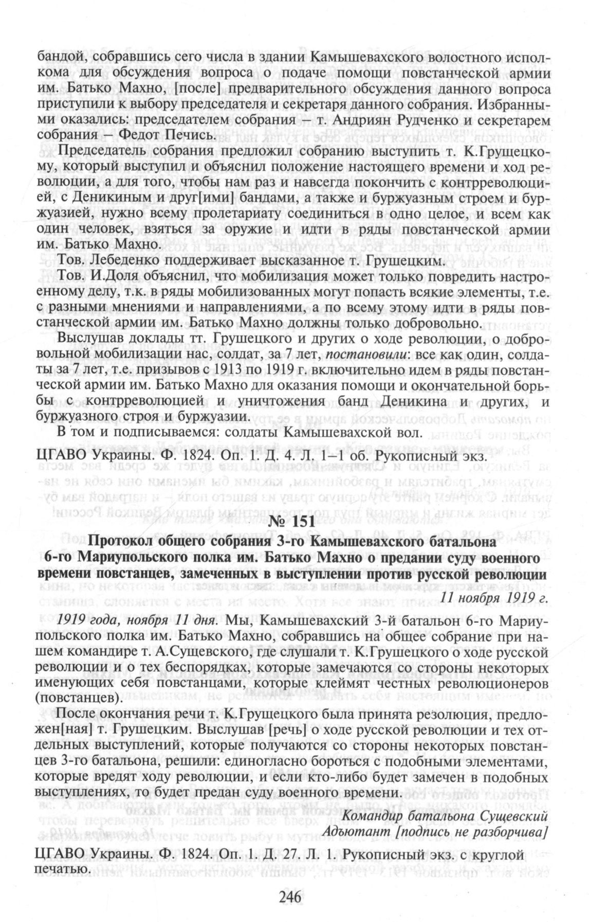 Протокол общего собрания 3-го Камышевахского батальона 6-го Мариупольского полка им. Батько Махно о предании суду военного времени повстанцев, замеченных в выступлении против русской революции. 11 ноября 1919 г. // ЦГАВО Украины. Ф. 1824. Oп. 1. Д. 27. Л. 1. Рукописный экз. с круглой печатью.