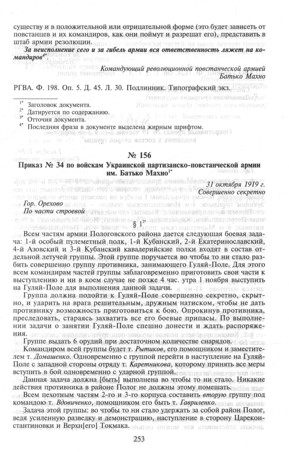 Приказ № 34 по войскам Украинской партизанско-повстанческой армии им. Батько Махно. 31 октября 1919 г. // ЦГАВО Украины. Ф. 1824. Oп. 1. Д. 7. Л. 1. Заверенная копия.