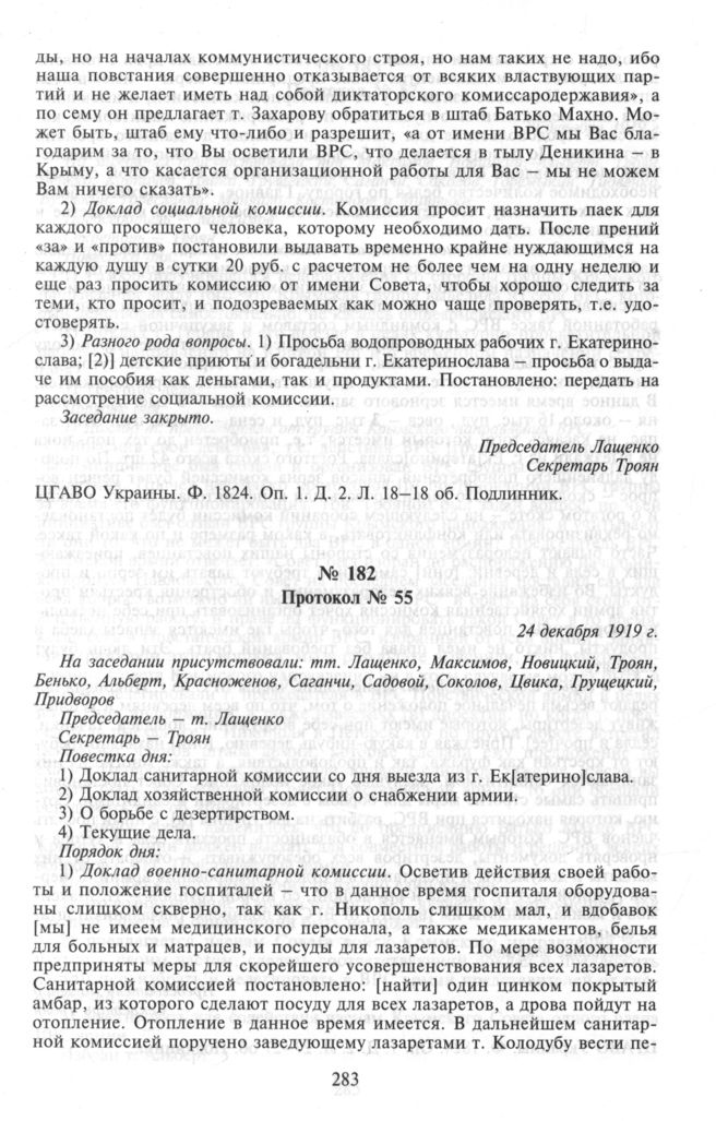 Протоколы совместных заседаний Военно-революционного Совета и командования Повстанческой армии махновцев. Протокол № 55. 24 декабря 1919 г.