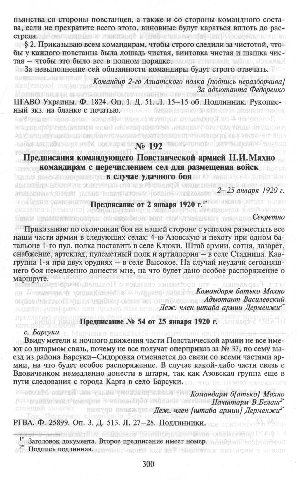 Предписания командующего Повстанческой армией Н.И. Махно командирам с перечислением сел для размещения войск в случае удачного боя. 2-25 января 1920 г. // РГВА. Ф. 25899. Оп. 3. Д. 513. Л. 27-28. Подлинники.