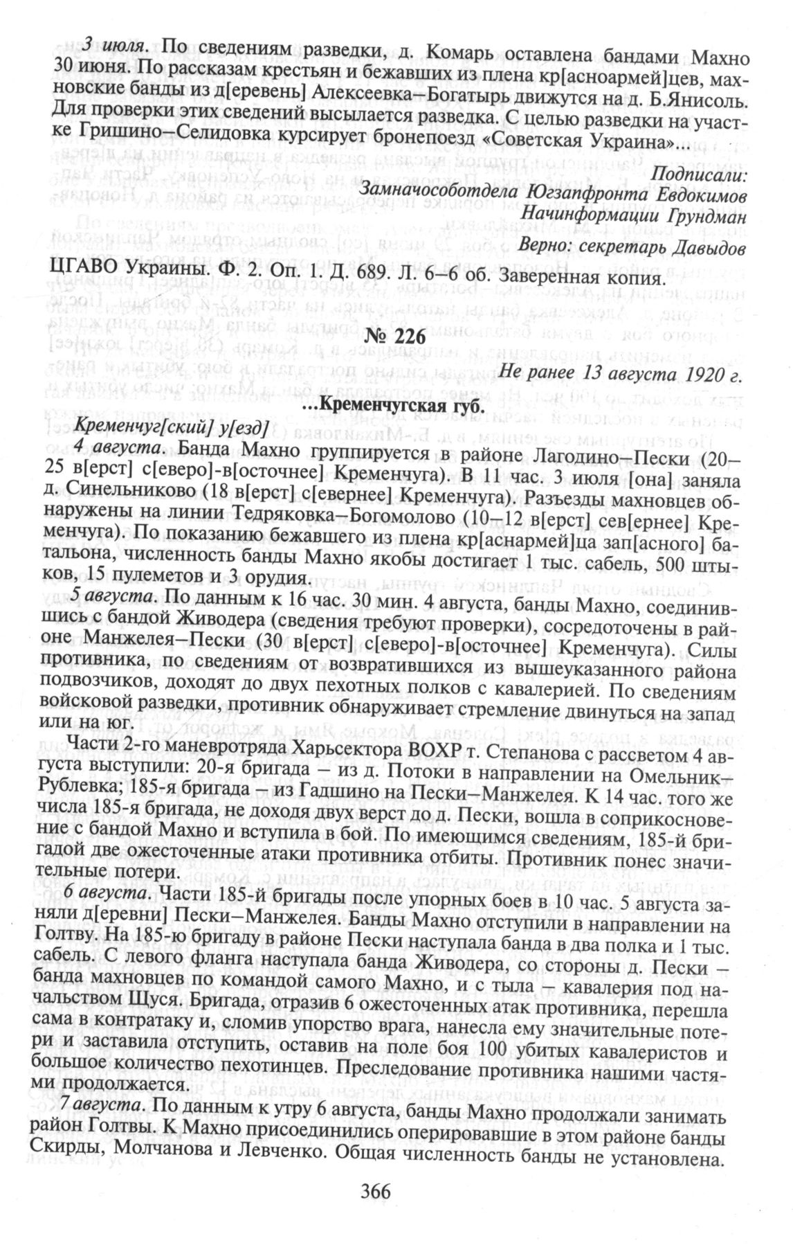 Из информационных сводок особого отдела Юго-Западного фронта о действиях махновских отрядов. Не ранее 13 августа 1920 г. // ЦГАВО Украины. Ф. 2. Oп. 1. Д. 691. Л. 41—42. Заверенная копия.