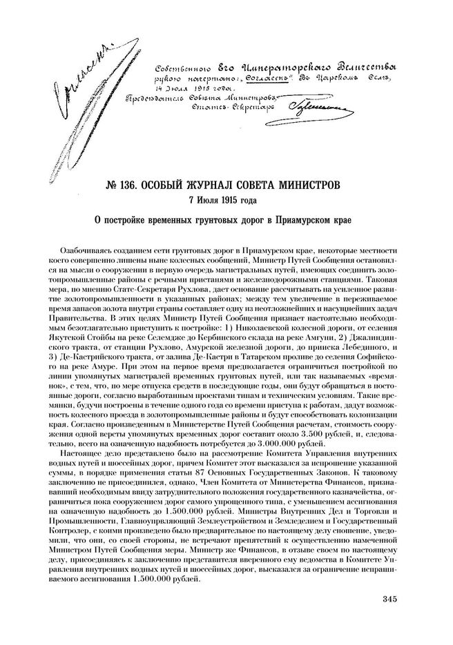 Особый журнал совета министров. 7 июля 1915 г. О постройке временных грунтовых дорог в Приамурском крае