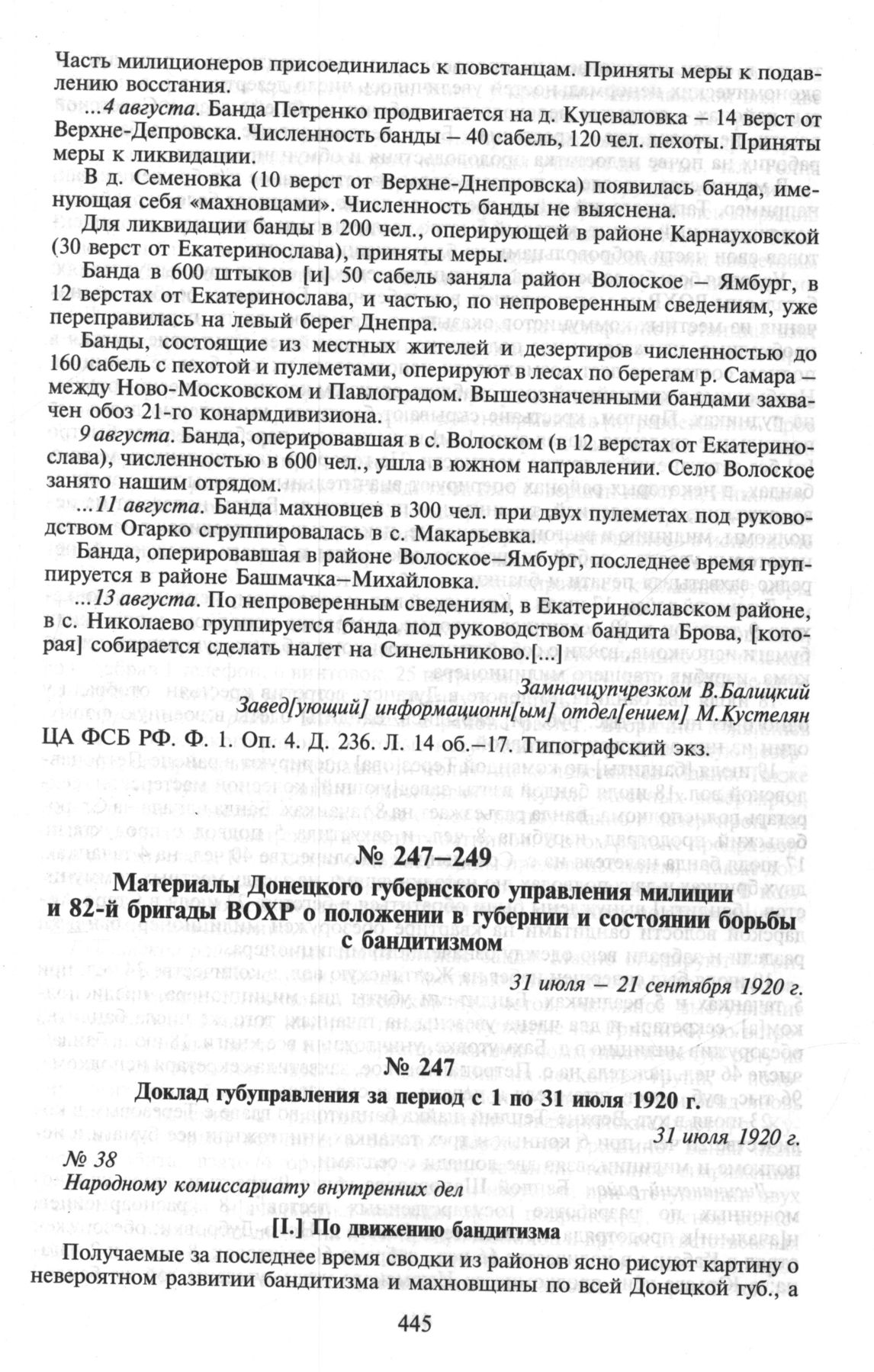 Материалы Донецкого губернского управления милиции и 82-й бригады ВОХР о положении в губернии и состоянии борьбы с бандитизмом. Доклад губуправления за период с 1 по 31 июля 1920 г. 31 июля 1920 г. // РГАСПИ. Ф. 71. Оп. 33. Д. 1581. Л. 3-17. Заверенная копия с перепечатан ного подлинника.