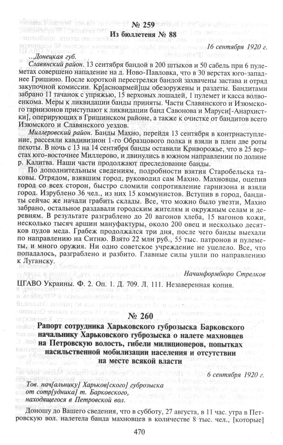 Из бюллетеней штаба Харьковского сектора ВОХР о действиях махновских отрядов в Екатеринославской, Донецкой и Полтавской губерниях. Из бюллетеня № 88. 16 сентября 1920 г. // ЦГАВО Украины. Ф. 2. Oп. 1. Д. 709. Л. 111. Незаверенная копия.