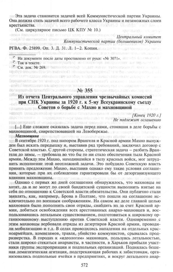 Из отчета Центрального управления чрезвычайных комиссий при совнаркоме Украины за 1920 г. к 5-му Всеукраинскому съезду Советов о борьбе с Махно и махновщиной. [Конец 1920 г.] // ГА СБУ. Ф. 13. Д. 253. С. 21-22. Типографский экз.