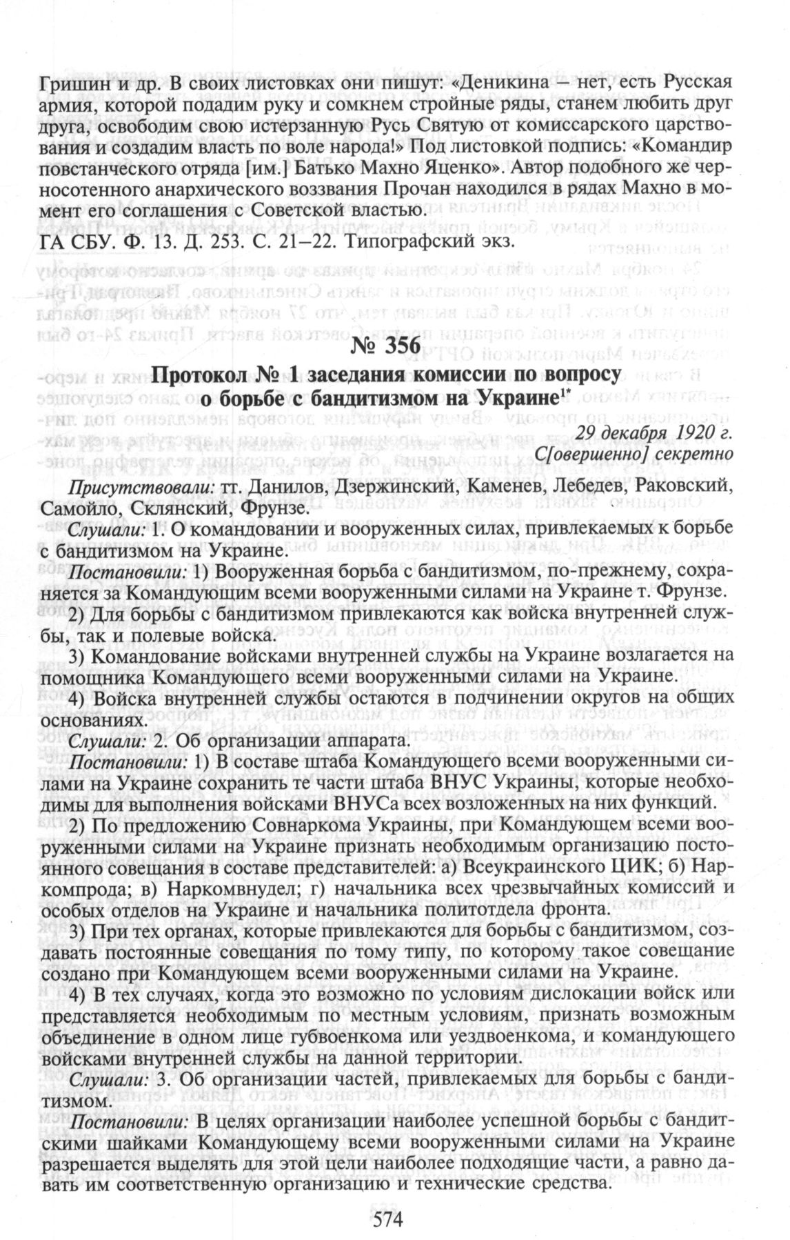 Протокол № 1 заседания комиссии по вопросу о борьбе с бандитизмом на Украине. 29 декабря 1920 г. // РГАСПИ. Ф. 76. Оп. 3. Д. 70. Л. 32—33. Заверенная копия.