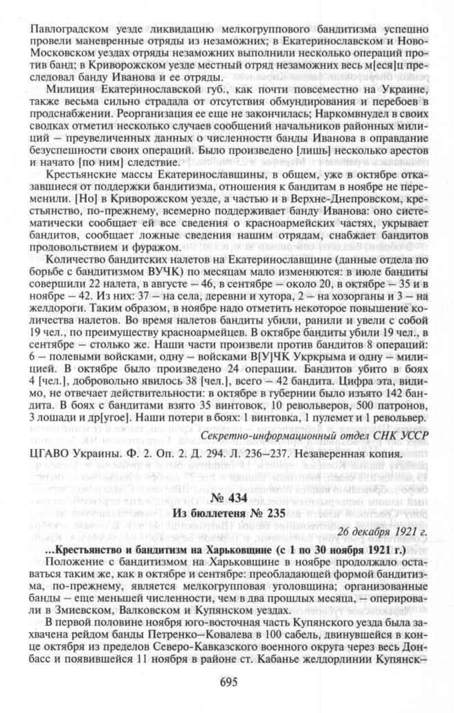 Из бюллетеней секретно-информационного отдела Совнаркома УССР о борьбе с движением бандитизма на Украине и настроении крестьянства. Из бюллетеня № 235. 26 декабря 1921 г. // ЦГАВО Украины. Ф. 2. Оп. 2. Д. 294. Л. 240—241. Незаверенная копия.